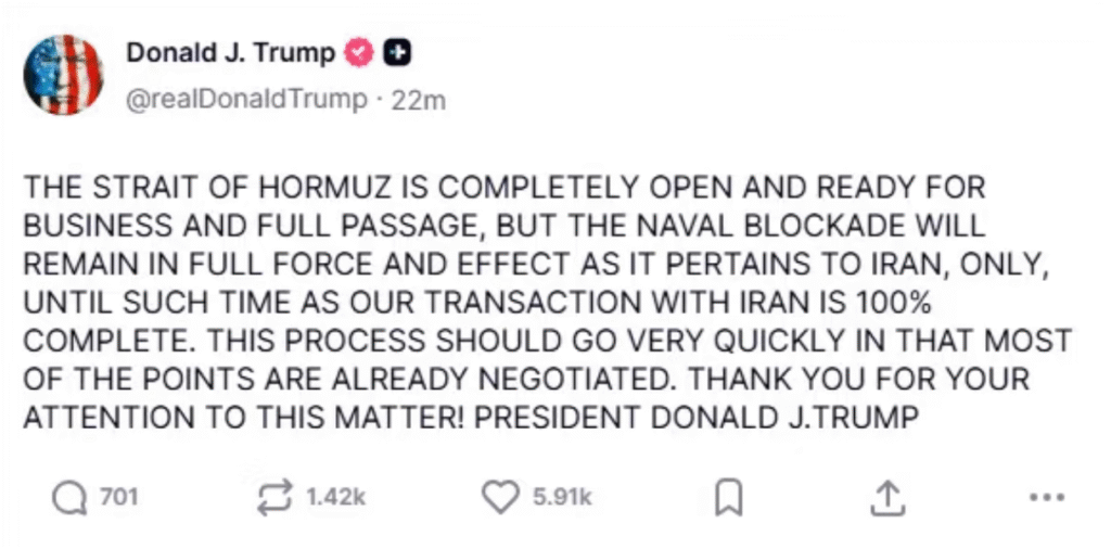 रोचक बात यह है कि ईरान के इस फैसले पर पहले ट्रंप ने ‘थैंक्यू’ कहा था। उन्होंने पोस्ट किया था, “ईरान ने अभी घोषणा की है कि होर्मुज पूरी तरह खुला है। धन्यवाद!” लेकिन कुछ ही घंटों बाद उन्होंने अपना रुख कड़ा करते हुए स्पष्ट कर दिया कि ‘रास्ता खुलने’ का मतलब ‘नाकेबंदी हटना’ नहीं है।